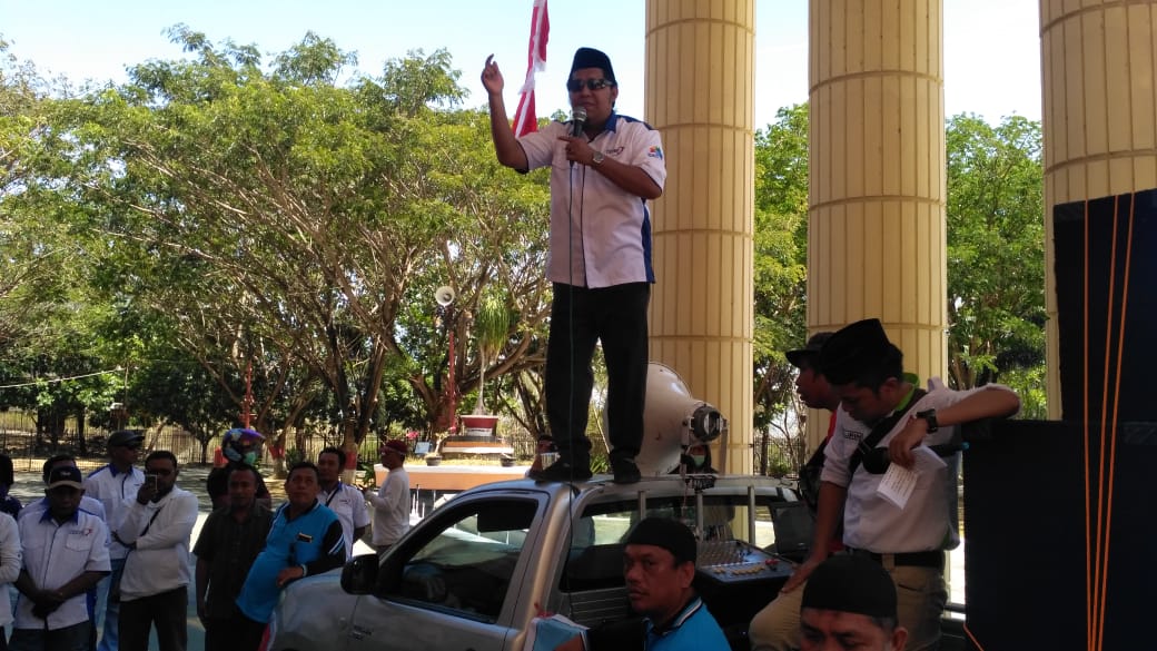 “Kami FSPMI Provinsi Gorontalo menyampaikan pernyataan sikap menolak revisi UU 13/2003, yang saat ini sedang digodok DPR RI. Kami menilai revisi UU tersebut akan merugikan kaum pekerja. Terutama menyangkut kesejahteraan pekerja” Jalas orator masa aksi