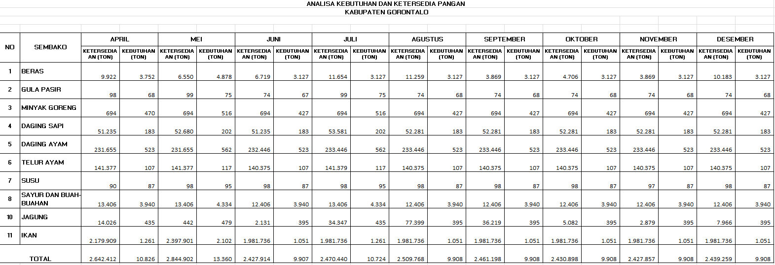 Berikut secara rinci ketersediaan dan kebutuhan bahan pangan di Kabupaten Gorontalo, Desember 2020. Dilansir dari Data Analisa Kebutuhan dan Ketersediaan Pangan, Dinas Ketahanan Kabupaten Gorontalo: