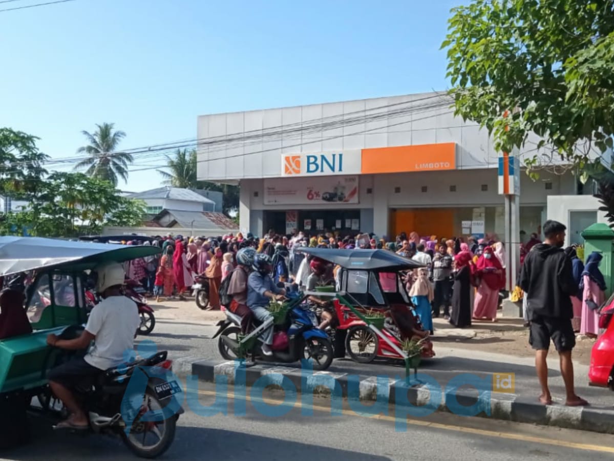 Dulohupa.id- Puluhan masyarakat calon penerima Banpres siang tadi, Jumat (9/4) memadati bank BNI Unit Limboto. Pantauan dulohupa.id, puluhan warga itu tampak tak mematuhi protokol kesehatan. Sebab, berkerumun tanpa menjaga jarak. Bahkan, dalam kondisi sesak, terlihat ada beberapa orang yang melepas maskernya.