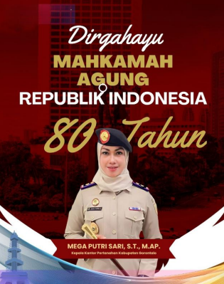 Gorontalo – Kepala Kantor Pertanahan Kabupaten Gorontalo, Mega Putri Sari beserta seluruh jajaran menyampaikan ucapan selamat atas peringatan Hari Ulang Tahun ke-80 Mahkamah Agung Republik Indonesia.