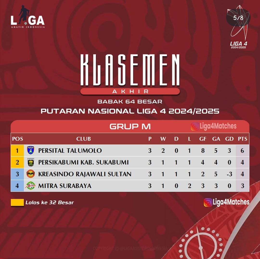Usai mengalahkan tim Persikabumi Sukabumi dengan skor 3-2 di stadion Ponegoro Banyuwangi, Persital Talumolo mengantongi 6 poin dan menempati klasemen teratas grup M dengan disusul tim Persikabumi Sukabumi dengan 4 poin, kemudian tim Kreasindo Rajawali dengan 4 poin, serta Mitra Surabaya dengan 3 poin.