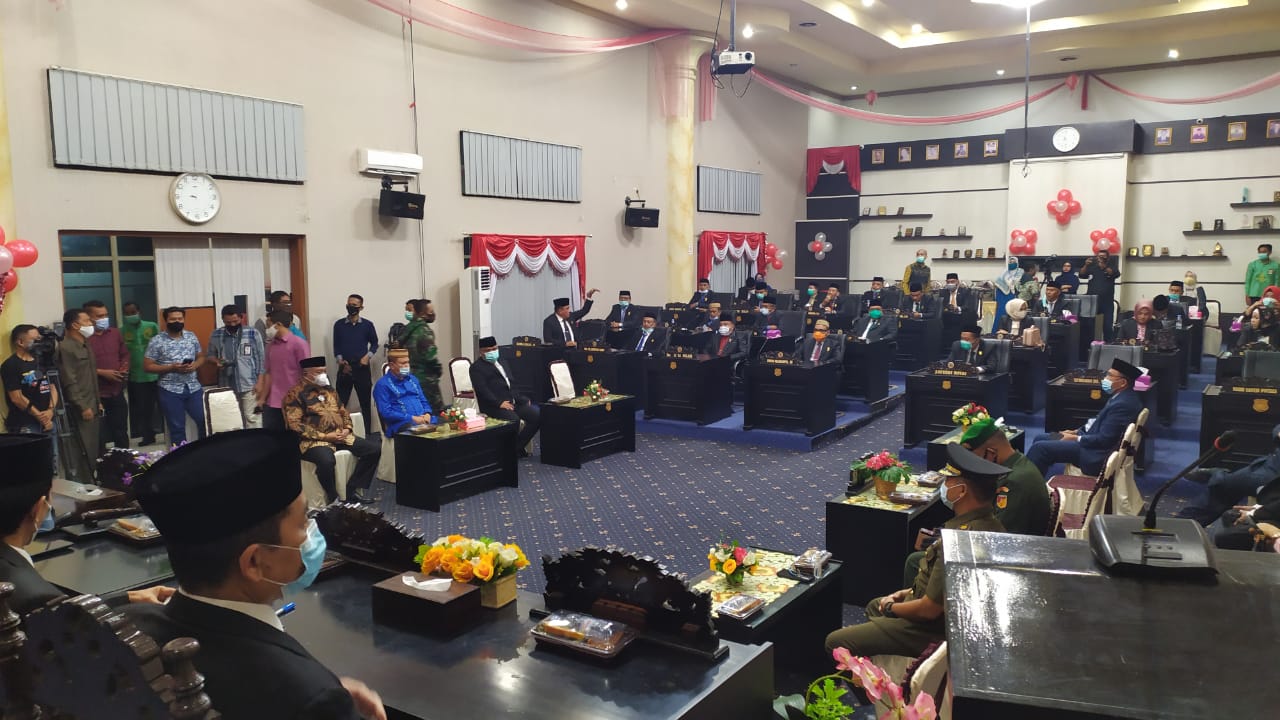 DULOHUPA.ID- Pemerintah Gorontalo membatasi jumlah peserta sidang paripurna istimewa pada Peringatan Hari Ulang Tahun (HUT) ke-374 Kabupaten Gorontalo, karena saat ini masih berlangsung pandemi COVID-19. Jumlah anggota DPRD yang hadir dalam sidang tersebut bahkan hanya 35 orang.
