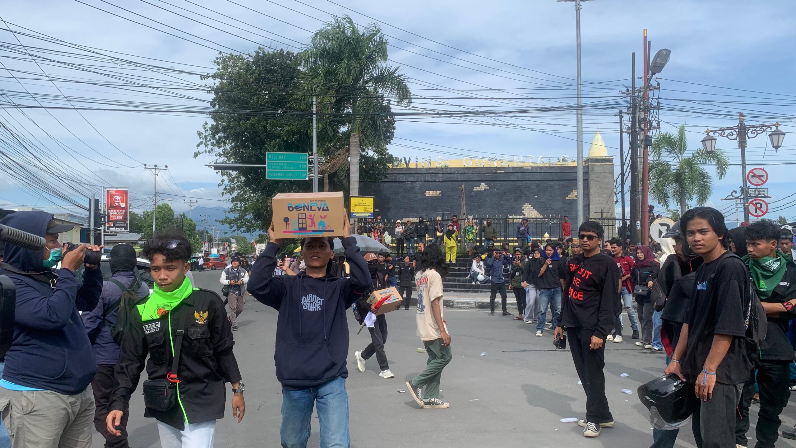 Dulohupa.id – Paman Eman, seorang warga rela memberikan bantuan logistik berupa air mineral (Aqua) kepada massa aksi Mahasiswa yang demo di simpang lima Telaga – Kota Gorontalo, Senin (01/92/205).