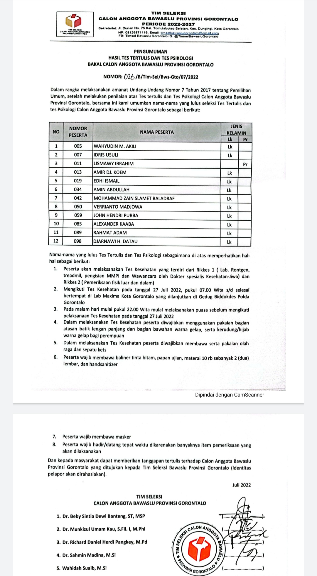 Pengumuman itu tertera dalam surat pengumuman dengan NOMOR /B/Tim-SeI/Bws-Gto/07/2022 ditandatangani langsung tim seleksi yang diketuai Dr Beby Sintia Dewi Banteng.