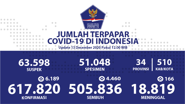 Selain itu, dari data hasil uji 426 laboratorium jejaring per 13 Desember 2020, jumlah spesimen selesai diperiksa per hari sebanyak 51.048 spesimen dan kumulatifnya 6.382.379 spesimen. Jumlah orang yang diperiksa per hari ini ada 25.347 orang dan kumulatifnya 4.279.168 orang.