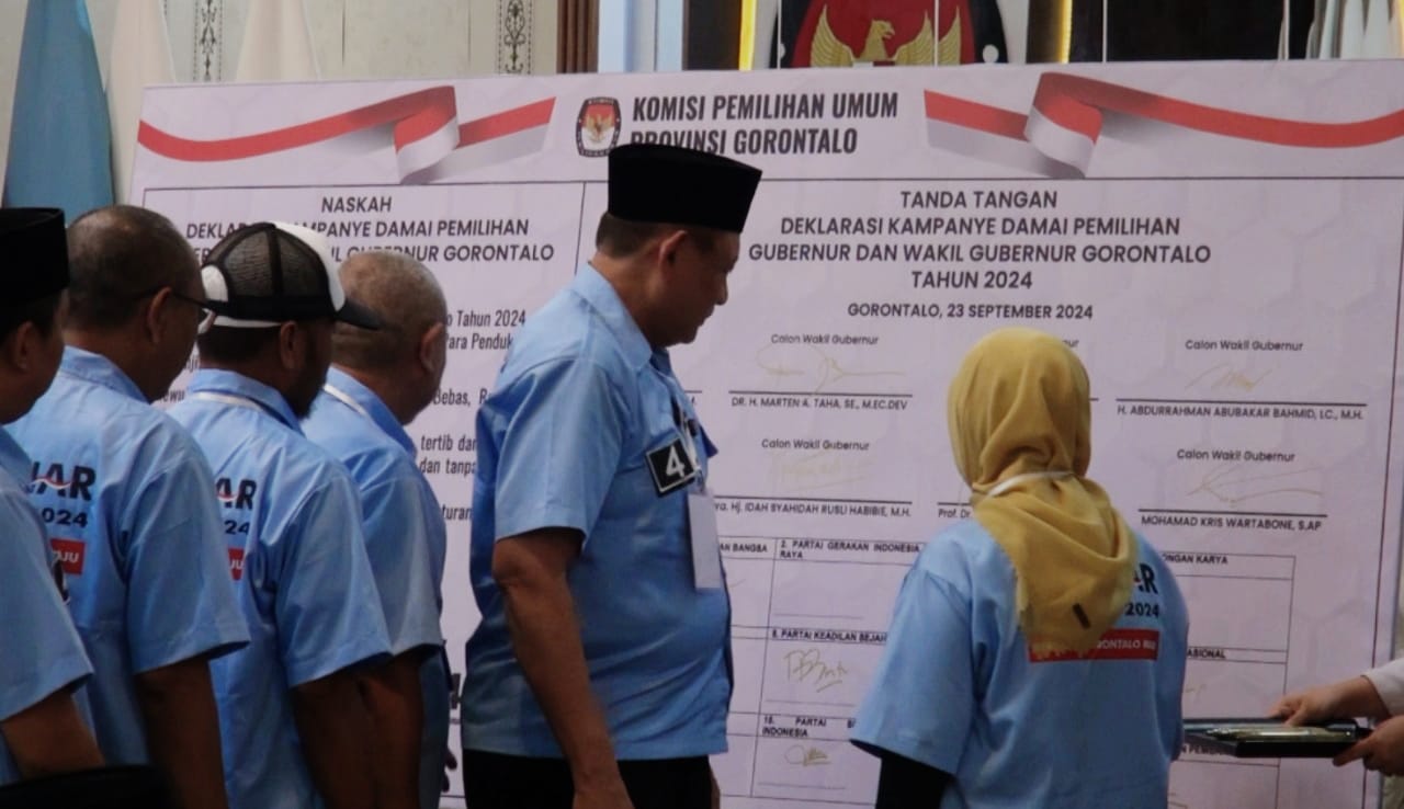 “Kampanye damai itu ada 3 poin, intinya kami mengajak mereka pasangan calon dan partai pengusul itu harus benar benar mengikuti ketentuan peraturan yang berlaku. Karena kampanye ini diikat oleh undang undang, sehingga secara terbuka tadi kami memandu deklarasi damai. Jadi kami meminta agar pasangan calon atau tim pemenangan untuk berkampanye anti hoax, anti SARA dan yang lainnya seperti kampanye aman dan damai,” Tegas Ketua KPU Provinsi Gorontalo, Sophian Rahmola.